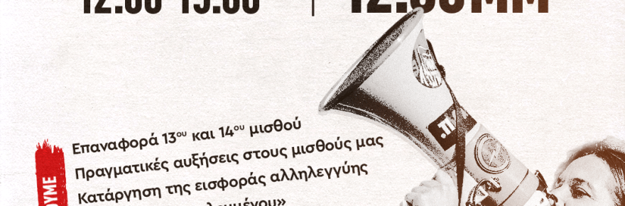 Καλούμε όλες/όλους τις/τους εργαζόμενες/ους στη συγκέντρωση διαμαρτυρίας, την Τρίτη 3 Φλεβάρη, στο ΣτΕ στις 12:30 μμ, και στην πορεία που θα ακολουθήσει προς το Υπουργείο Οικονομικών για να απαιτήσουμε την άμεση έκδοση της απόφασης που αφορά των επαναφορά του 13ου-14ου μισθού.