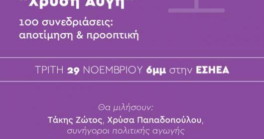Μετά από 100 συνεδριάσεις της δίκης της ναζιστικής εγκληματικής οργάνωσης “Χρυσή Αυγή”, η πρωτοβουλία δικηγόρων για την “Πολιτική Αγωγή του Αντιφασιστικού Κινήματος” οργανώνει την Τρίτη 29 Νοεμβρίου εκδήλωση αποτίμησης της μέχρι σήμερα διαδικασίας και εκτίμησης της μετέπειτα πορείας της. Η εξέταση μαρτύρων κατηγορίας και για τις τρεις συνεκδικαζόμενες, πιο εμβληματικές, επιθέσεις της Χρυσής Αυγής – ανθρωποκτονία Παύλου Φύσσα, απόπειρες ανθρωποκτονιών