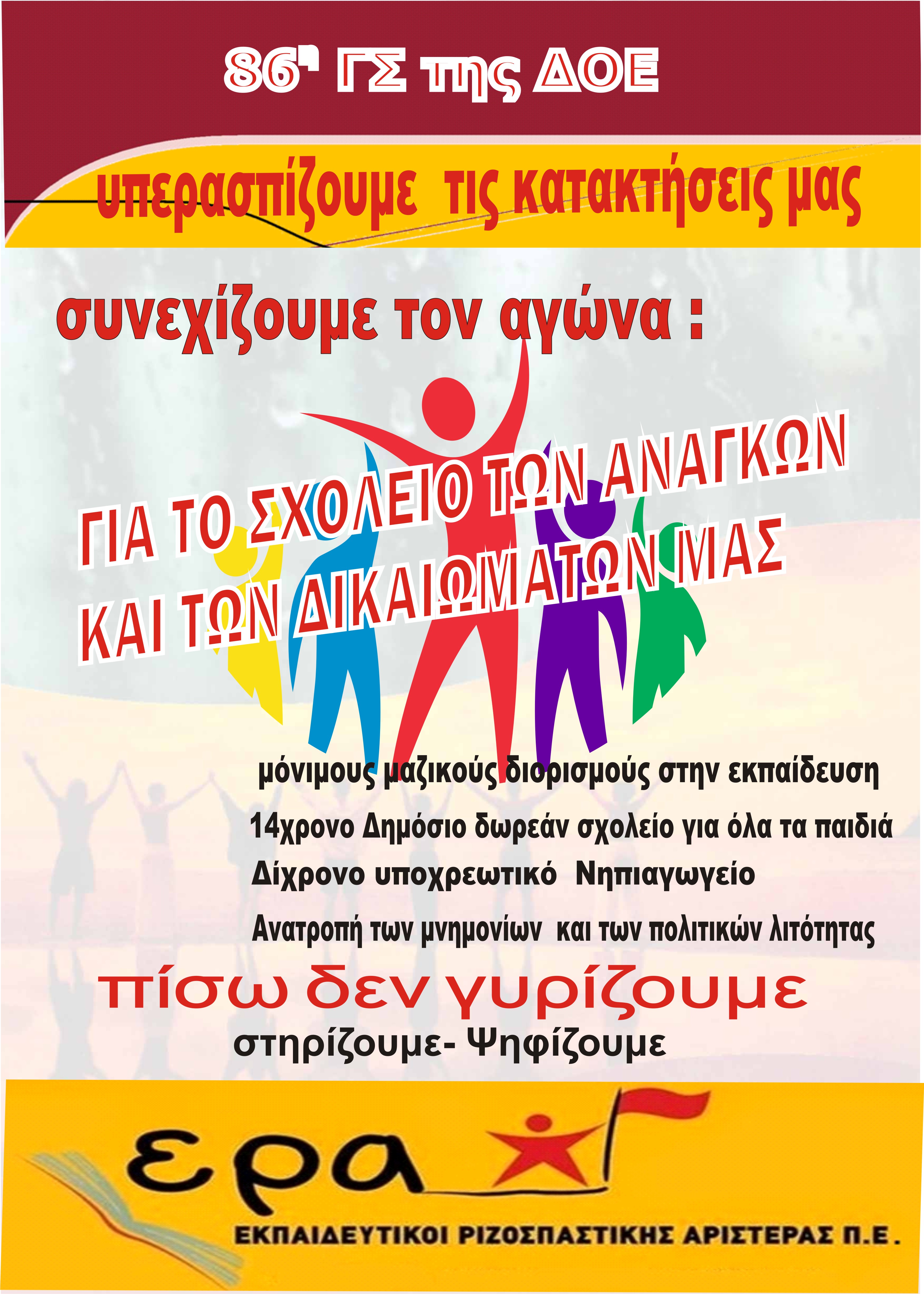 Η ΕΡΑ καλεί όλους τους συναδέλφους-σες μαζικά και ενωτικά να συμμετέχουν στις Γ.Σ των συλλόγων και στις εκλογές αντιπροσώπων για την 86η ΓΣ της ΔΟΕ και να υπερψηφίσουν το αγωνιστικό πλαίσιο διεκδικήσεων και αγώνα που προτείνει αλλά και τα ψηφοδέλτια που στηρίξει.