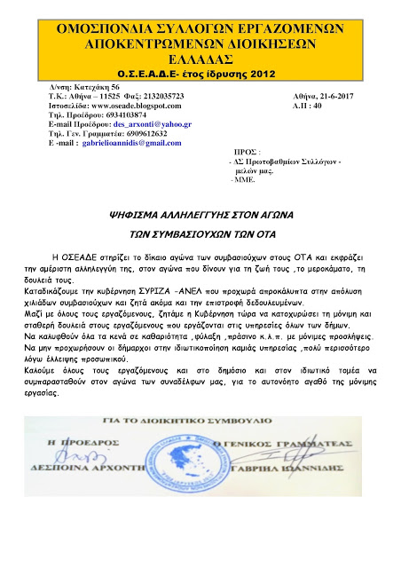 ΟΣΕΑΔΕ: Ψήφισμα αλληλεγγύης στον αγώνα των συμβασιούχων στους ΟΤΑ Posted on 22/06/2017 by ΑΡΚΙ κοινοποιήση: Κλικ για αποστολή ενός συνδέσμου μέσω email σε έναν/μία φίλο/η(Ανοίγει σε νέο παράθυρο) Email Κλικ για εκτύπωση(Ανοίγει σε νέο παράθυρο) Εκτύπωση Πατήστε για κοινοποίηση στο Facebook(Ανοίγει σε νέο παράθυρο) Facebook Κλικ για κοινοποίηση στο LinkedIn(Ανοίγει σε νέο παράθυρο) LinkedIn Κάνε κλικ για να μοιραστείς στο X(Ανοίγει σε νέο παράθυρο) Χ Μου αρέσει! Φόρτωση... Σχετικά Αλληλεγγύη Ο.Σ.Ε.Α.Δ.Ε. Συνδικαλιστικά