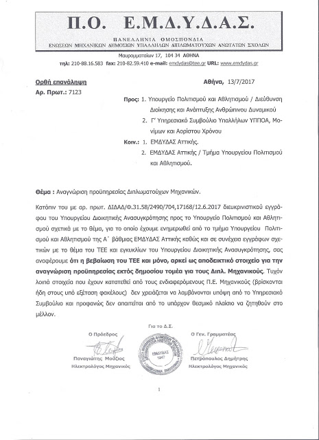 Με αφορμή το έγγραφο της Ομοσπονδίας της ΕΜΔΥΔΑΣ, θα θέλαμε για άλλη μια φορά να τονίσουμε ότι δεν χωράει πια αμφισβήτιση από κανέναν ότι η βεβαίωση του ΤΕΕ και μόνο, αρκεί ως αποδεικτικό στοιχείο για την αναγνώριση προϋπηρεσίας εκτός δημοσίου τομέα για τους Διπλ. Μηχανικούς, και για τον λόγο αυτό θεωρούμε ότι το θέμα δεν χρήζει άλλης καθυστέρησης από το Γ’ Υπηρεσιακό Συμβούλιο του ΥΠΠΟΑ.