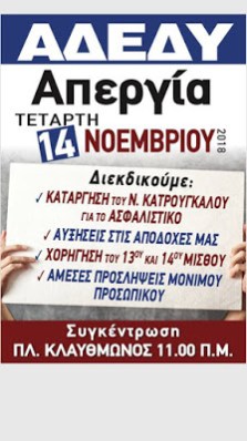 Κάλεσμα της ΑΣΚ-ΟΤΑ για συμμετοχή στις κινητοποιήσεις της ΑΔΕΔΥ και της ΠΟΕ-ΟΤΑ στην πανελλαδική απεργία της 14ης Νοεμβρίου 2018