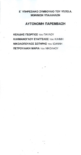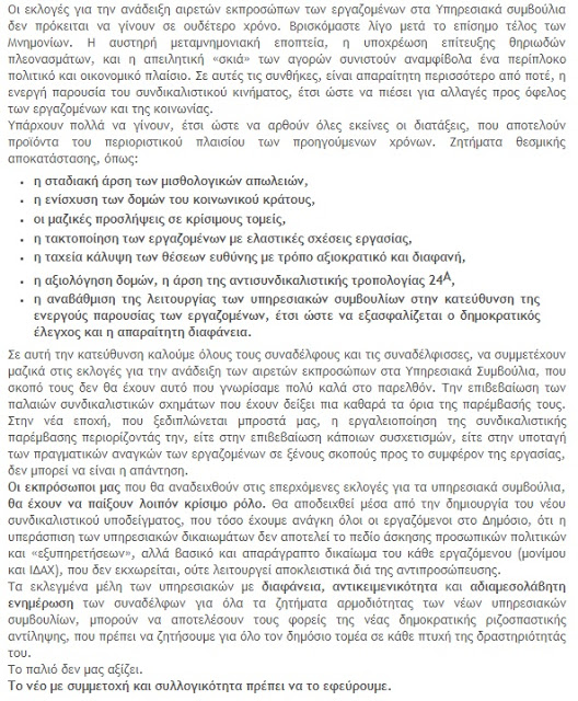 Στις εκλογές για την ανάδειξη των αιρετών εκπροσώπων των εργαζομένων του ΥΠΠΟΑ στηρίζουμε τα ενωτικά ψηφοδέλτια και τα ριζοσπαστικά ψηφοδέλτια της Αυτόνομης Παρέμβασης, γιατί τα Υπηρεσιακά Συμβούλια, όπως και τα Πειθαρχικά, θα πρέπει να είναι πεδία καθημερινής μάχης απέναντι στις αυθαιρεσίες της εκάστοτε Διοίκησης των Υπουργείων.