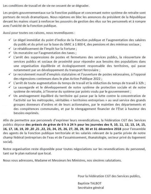 Στην ανακοίνωση του συνδικάτου Cgt Service Publiques που υπογράφει ο Γραμματέας της Baptiste Talbot, προκηρύχθηκε Απεργία με ημερομηνία έναρξης 9 Δεκέμβρη μέχρι και 31 Δεκέμβρη, που σημαίνει ότι θα παραλύσει στην κυριολεξία ο δημόσιος τομέας και πως η σύγκρουση του υπαλλήλου των Ρότσιλντ με τις λαϊκές μάζες είναι ακόμη σε αρχικά στάδια.