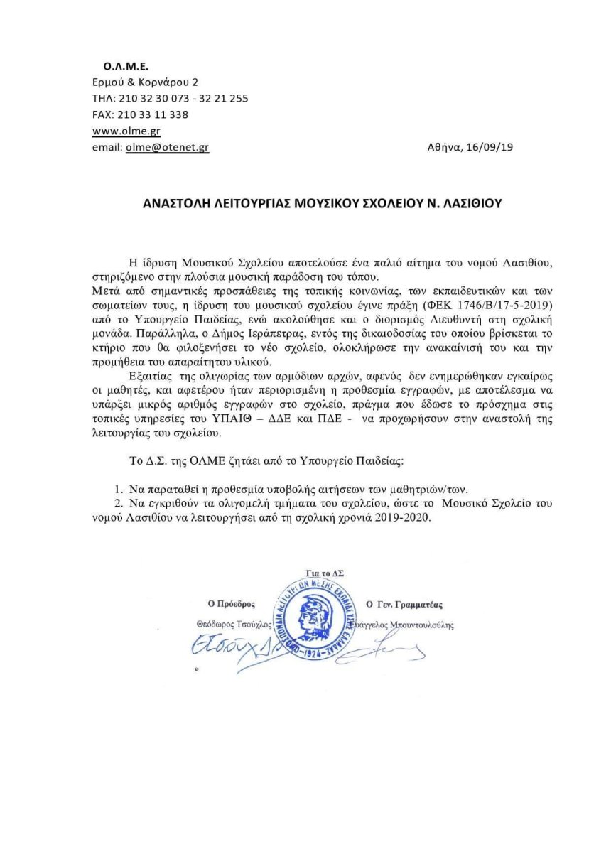 Καταγγελία ΟΛΜΕ για την αναστολή λειτουργίας του μουσικού σχολείου Ν.Λασιθίου Posted on 16/09/2019 by ΑΡΚΙ κοινοποιήση: Κλικ για αποστολή ενός συνδέσμου μέσω email σε έναν/μία φίλο/η(Ανοίγει σε νέο παράθυρο) Email Κλικ για εκτύπωση(Ανοίγει σε νέο παράθυρο) Εκτύπωση Πατήστε για κοινοποίηση στο Facebook(Ανοίγει σε νέο παράθυρο) Facebook Κλικ για κοινοποίηση στο LinkedIn(Ανοίγει σε νέο παράθυρο) LinkedIn Κάνε κλικ για να μοιραστείς στο X(Ανοίγει σε νέο παράθυρο) Χ Μου αρέσει! Φόρτωση... Σχετικά ΟΛΜΕ