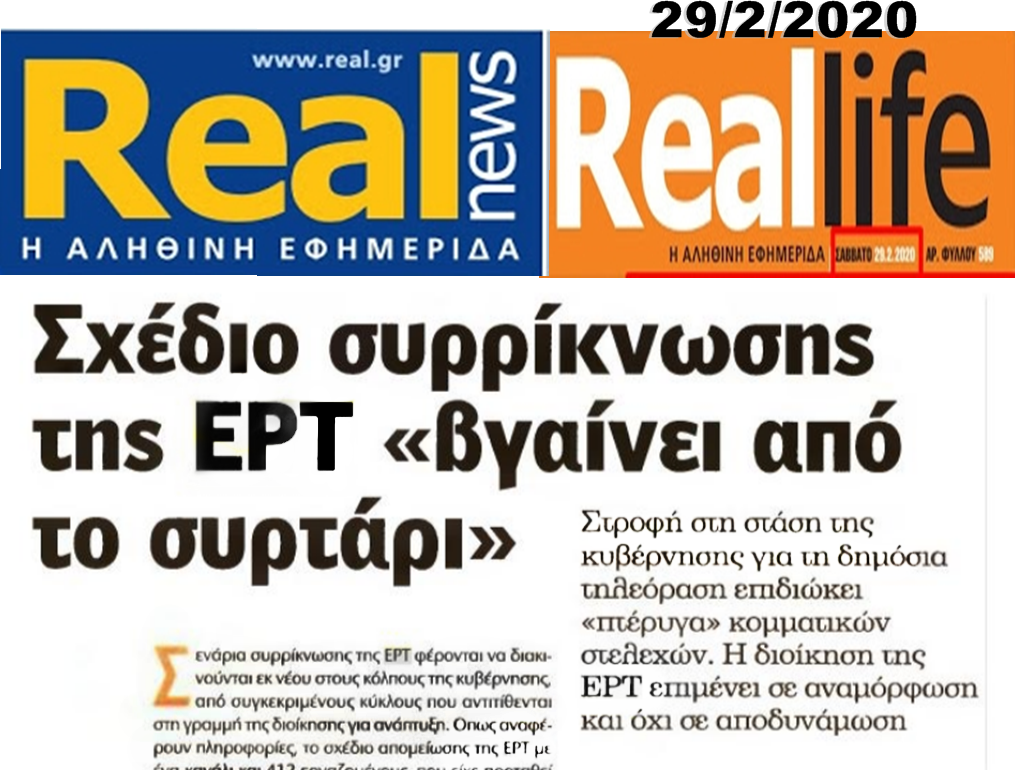Πέρα απο την προφανή «αβάντα» στη διοίκηση Γαμπρίτσου – Ζούλα, τo «ρεπορτάζ» της real news , όπως καταγράφεται στο ένθετο real life της προηγούμενης Παρασκευής 29/2/2020, σχετικά με την επαπειλούμενη συρρίκνωση της ΕΡΤ και την δραστική μείωση του προσωπικού στα 412 άτομα, αφενός έχει «ειδική» αξία δεδομένου ότι η ίδια εφημερίδα στις 26 Μαΐου του 2013 με πρωτοσέλιδο δημοσίευμά της «αποκάλυπτε» την απόφαση της τότε κυβέρνησης να κλείσει την ΕΡΤ, αφετέρου επιβεβαιώνει αυτά που η ΠΟΣΠΕΡΤ καταγγέλλει με ανακοινώσεις της εδώ και καιρό , ότι δηλαδή ο απώτερος στόχος της κυβέρνησης είναι να συρρικνωθεί η ΕΡΤ σε μέγεθος, ποιότητα και προσωπικό στα επίπεδα των μορφωμάτων της ΔΤ και της ΝΕΡΙΤ.