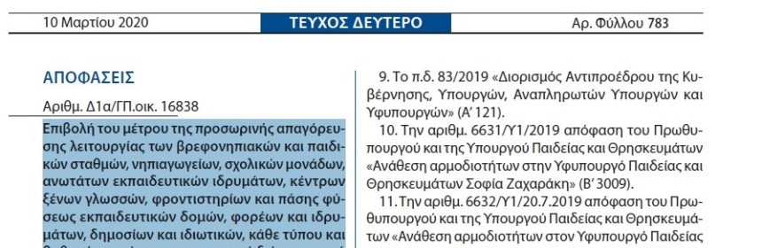 Δημοσιεύτηκαν σε ΦΕΚ οι αποφάσεις που αφορούν σε: 783Β/10-03-2020 Επιβολή του μέτρου της προσωρινής απαγόρευσης λειτουργίας των βρεφονηπιακών και παιδικών σταθμών, νηπιαγωγείων, σχολικών μονάδων, ανωτάτων εκπαιδευτικών ιδρυμάτων, κέντρων ξένων γλωσσών, φροντιστηρίων και πάσης φύσεως εκπαιδευτικών δομών, φορέων και ιδρυμάτων, δημοσίων και ιδιωτικών, κάθε τύπου και βαθμού της χώρας για το χρονικό διάστημα από 11.3.2020 έως και 24.3.2020. 782Β/10-03-2020 Επιβολή του