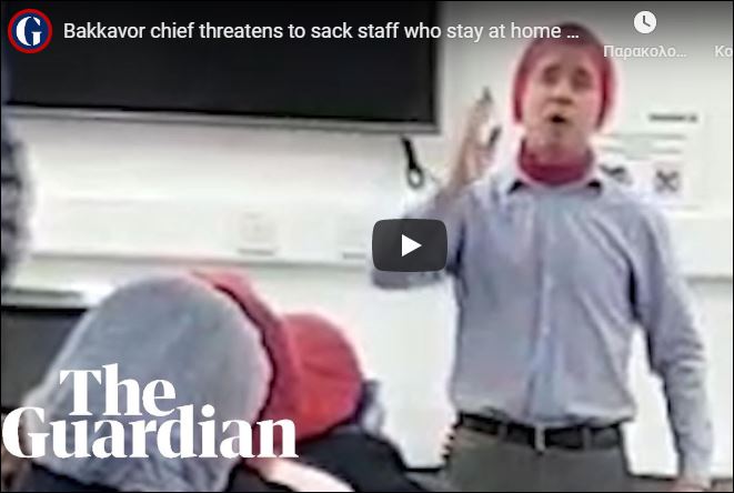 Ο Σον Μάντεν, επικεφαλής της Bakkavor, ακούγεται να λέει στους αποσβολωμένους εργάτες ότι το μέλλον τους στην εταιρεία είναι αμφίβολο εάν μείνουν στο σπίτι.
