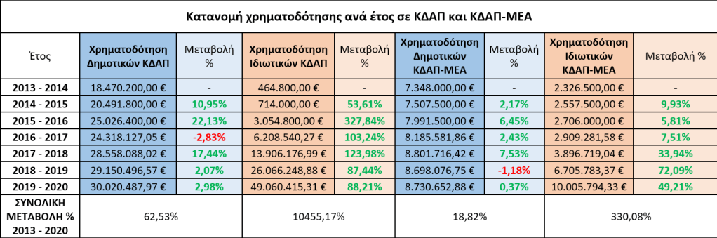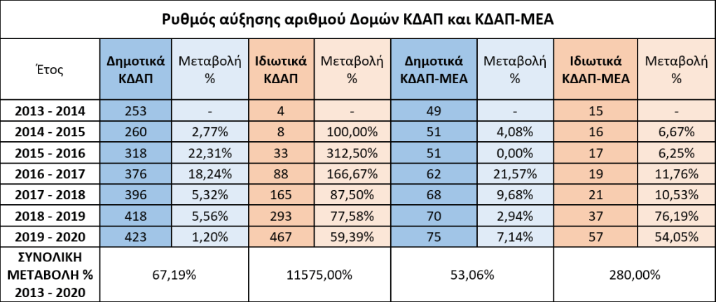 Από τα στοιχεία των παραπάνω πινάκων αποδεικνύεται ξεκάθαρα πως η τοποθέτηση της Υφυπουργού αλλά και του Κυβερνητικού Εκπροσώπου ότι «..αυξήθηκε ΚΑΙ ο αριθμός των δημοτικών ΚΔΑΠ κατά 63%…», δεν είναι ακριβής, καθώς, όπως φαίνεται και στους πίνακες, τα δημοτικά ΚΔΑΠ αυξάνονται με πολύ πιο αργούς και σταθερούς ρυθμούς, οπότε σε καμία περίπτωση δεν τεκμηριώνεται το αναφερθέν από τους Υπουργούς ποσοστό. Κάτι που επαληθεύεται και από το γεγονός ότι το Μητρώο Φορέων/Δομών της ΕΕΤΑΑ για το έτος 2020-2021 δεν έχει «κλειδώσει» ακόμα, καθώς υπάρχουν Δομές που εξακολουθούν να εγγράφονται.
