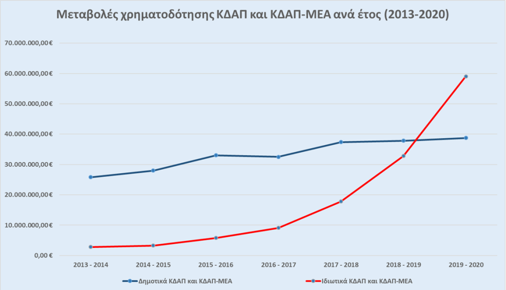 Όταν παρατηρείται μία αύξηση κατά 133% (κατά μ.ο.) το έτος από το 2013 ως το 2019 στην ίδρυση ιδιωτικών ΚΔΑΠ, είναι απολύτως και στατιστικώς αναμενόμενο ένα αντίστοιχο ποσοστό να προκύψει και φέτος. Αντιστοίχως, στους πίνακες που έφτιαξε ο ΠΑΣΕΚΔΑΠ και κατέθεσε όλους τους προηγούμενους μήνες στα αρμόδια Υπουργεία αποτυπώνεται ανάγλυφα και η παράλληλη αύξηση των χρηματοδοτικών αναγκών. Μία κατακόρυφη αύξηση απαιτούμενων πόρων με κύριο αποδέκτη την ιδιωτική «επιχειρηματικότητα με κρατικούς πόρους».