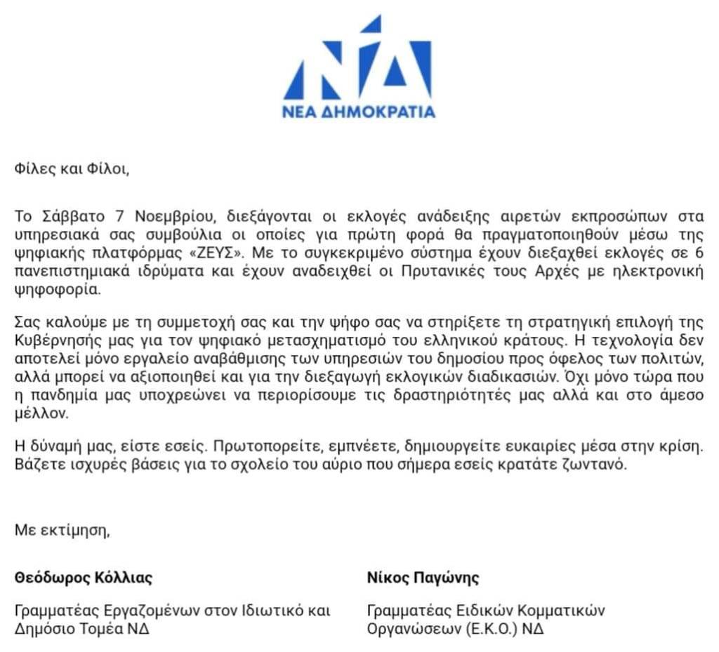 Η Νέα Δημοκρατία έχει ξεφύγει πλέον, ο κατήφορος τους δεν έχει προηγούμενο. Η επιστολή αυτή πηγαίνει σε φίλους και μέλη της ΝΔ που τα καλεί να ψηφίσουν και να στηρίξουν την ΕΠΙΛΟΓΗ της ΚΥΒΕΡΝΗΣΗΣ στις ηλεκτρονικές εκλογές της 7ης Νοεμβρίου.