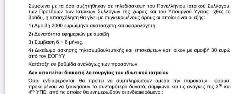 Οι «προσλήψεις» της Κυβέρνησης της Ν.Δ στο Ε.Σ.Υ: Ιδιώτες γιατροί, 2000€ καθαρά το μήνα (αφορολόγητα..) 6+6 μήνες Σύμβαση, διατήρηση Ιατρείου. Η Ιδιωτικοποίηση παίρνει «σάρκα και οστά»…