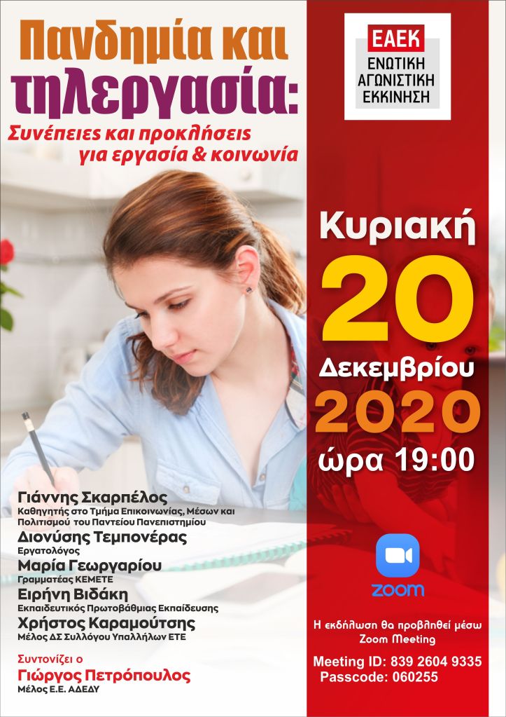 Διαδικτυακή Εκδήλωση: “Πανδημία και τηλεργασία – Συνέπειες και προκλήσεις για εργασία και Κοινωνία”