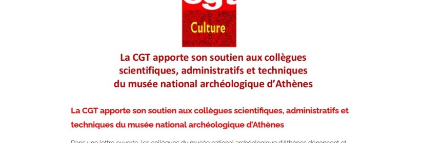 Μήνυμα συμπαράστασης από τους Γάλλους εργαζόμενους του πολιτιστικού τομέα για την αλλαγή του πλαισίου λειτουργίας των μεγάλων ελληνικών δημοσίων μουσείων. Το CGT* (ομοσπονδία εργαζομένων στον τομέα του πολιτισμού στην Γαλλία) στηρίζει τους εργαζόμενους συναδέλφους του Εθνικού Αρχαιολογικού Μουσείου Αθηνών. Σύμφωνα με σχετική ανακοίνωσή του: Με ανοιχτή επιστολή οι συνάδελφοί μας εργαζόμενοι του εθνικού αρχαιολογικού μουσείου Αθηνών εκφράζουν την αντίθεσή τους