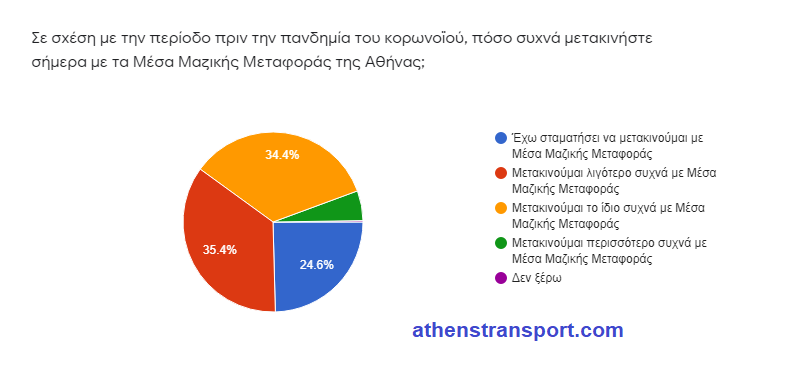 Η πλειοψηφία όσων απάντησαν στην έρευνα (35,4%) μετακινείται λιγότερο συχνά με τα Μέσα Μαζικής Μεταφοράς σήμερα σε σχέση με την περίοδο πριν την πανδημία. Λίγο μικρότερο ποσοστό (34,4%) απάντησε πως μετακινείται με την ίδια συχνότητα, ενώ περίπου ένας στους τέσσερις (24,6%) απάντησαν πως έχουν σταματήσει να μετακινούνται με τα Μέσα Μαζικής Μεταφοράς. Τέλος, το 5,4% απάντησε πως σήμερα μετακινείται περισσότερο συχνά με τα ΜΜΜ.