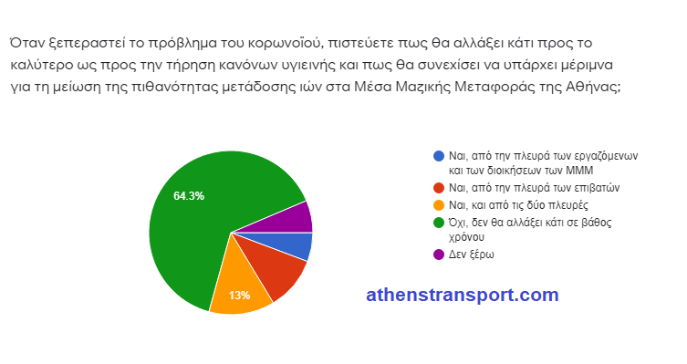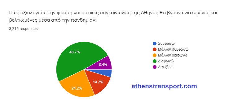 Οι συμμετέχοντες στην έρευνα, κλήθηκαν να αξιολογήσουν τη φράση «οι αστικές συγκοινωνίες της Αθήνας θα βγουν ενισχυμένες και βελτιωμένες μέσα από την πανδημία». Το 72,9% διαφωνεί ή μάλλον διαφωνεί με τη φράση αυτή, ενώ μόνο to 18,7% συμφωνεί ή μάλλον συμφωνεί. Το 8,4% απάντησε πως δεν γνωρίζει.