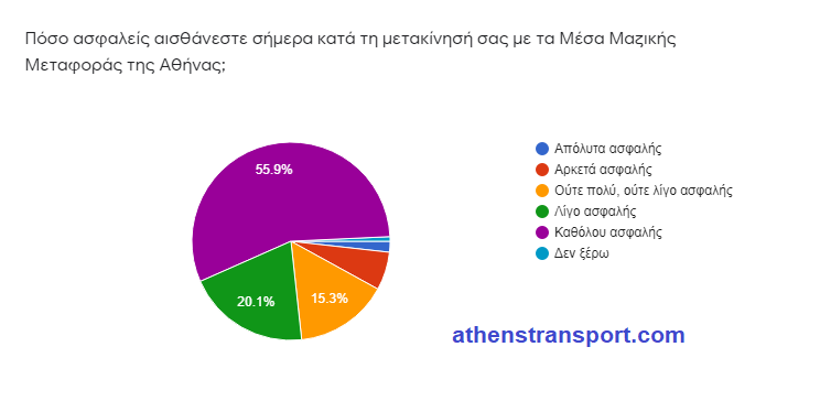 Πόσο ασφαλείς αισθάνονται όμως οι επιβάτες σήμερα; Περισσότεροι από τους μισούς (55,9%), απάντησαν πως σήμερα δεν αισθάνονται καθόλου ασφαλείς κατά τη μετακίνησή τους με τα Μέσα Μαζικής Μεταφοράς της Αθήνας. Το 20,1% αισθάνονται λίγο ασφαλείς και το 15,3% ούτε πολύ, ούτε λίγο ασφαλείς. Μόνο το 6,2% αισθάνονται αρκετά ασφαλείς και το 1,8% απόλυτα ασφαλείς.