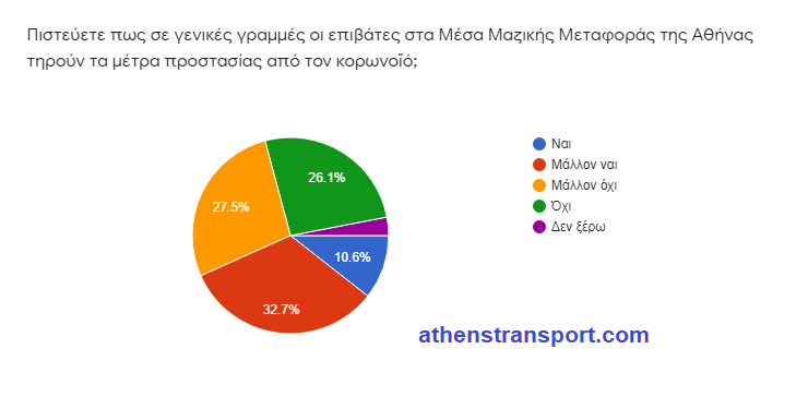 Τα μέσα στα οποία οι επιβάτες αισθάνονται λιγότερο ασφαλείς ως προς την προστασία από τον κορωνοϊό είναι τα Λεωφορεία και Τρόλεϊ (76,8%), ο Ηλεκτρικός Σιδηρόδρομος (39,7%), το Μετρό (29,2%), το Τραμ (6,2%) και ο Προαστιακός (4%).