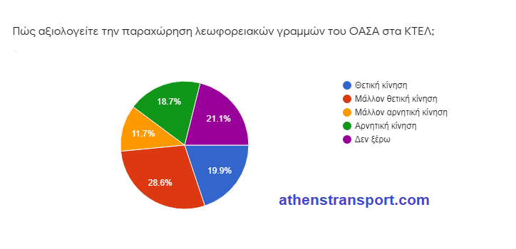 Όσον αφορά την παραχώρηση λεωφορειακών γραμμών του ΟΑΣΑ στα ΚΤΕΛ, το 48,5% την χαρακτηρίζει θετική ή μάλλον θετική κίνηση. Αρνητική ή μάλλον αρνητική κίνηση την χαρακτηρίζει το 30,4%, ενώ το 21,1% δεν έχει γνώμη.