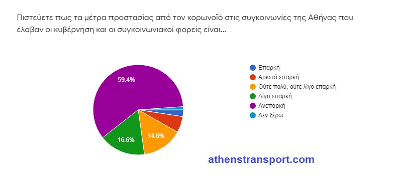 Η μεγάλη πλειοψηφία εξάλλου (59,4%) χαρακτηρίζει ανεπαρκή τα μέτρα προστασίας από τον κορωνοϊό που έχουν λάβει οι κυβέρνηση και οι συγκοινωνιακοί φορείς για τα Μέσα Μαζικής Μεταφοράς. Το 16,6% απάντησε πως είναι λίγο επαρκή, το 14,6% ούτε πολύ, ούτε λίγο επαρκή, ενώ μόνο το 5,8% τα χαρακτηρίζει αρκετά επαρκή και το 2,4% επαρκή.