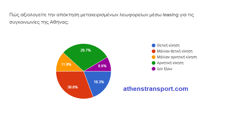 Ως προς την προμήθεια μεταχειρισμένων λεωφορείων μέσω leasing για τις συγκοινωνίες της Αθήνας, το 49,9% πιστεύει πως είναι θετική ή μάλλον θετική κίνηση. Αντίθετη άποψη έχει το 41,6%, ενώ το 8,6% δεν εκφέρει γνώμη.
