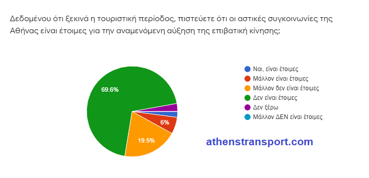 Η έναρξη της τουριστικής περιόδου που αναμένεται να κορυφωθεί μέσα στο επόμενο δίμηνο όπως είναι αναμενόμενο, θα φέρει αύξηση της επιβατικής κίνησης. Η μεγάλη πλειοψηφία (69,6%) πιστεύει πως οι αστικές συγκοινωνίες της Αθήνας δεν είναι έτοιμες για την αναμενόμενη αύξηση της επιβατικής κίνησης, ενώ το 19,5% απάντησε επίσης πως μάλλον δεν είναι έτοιμες. Μόνο το 6% πιστεύει πως μάλλον είναι έτοιμες και το 2,1% πως είναι έτοιμες.