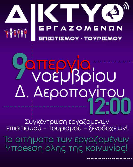 Έτσι, καλούμε κάθε νέα και κάθε νέο, κάθε εργαζόμενο να έρθει στις #9_Νοεμβρίου, στις 12:00, στη συγκέντρωση του κλάδου Επισιτισμού – Τουρισμού (Διονυσίου Αεροπαγίτου) για να διεκδικήσουμε όλα όσα μας ανήκουν.