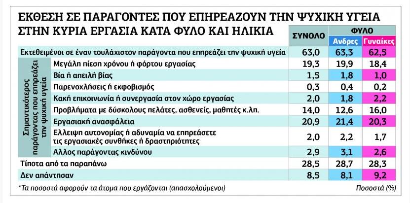 Οι εργαζόμενοι που ρωτήθηκαν από τους ερευνητές της ΕΛΣΤΑΤ για το ποιοι είναι αυτοί οι παράγοντες αναφέρουν συχνότερα την εργασιακή ανασφάλεια (20,9%) και την εντατικοποίηση της εργασίας, δηλαδή τη μεγάλη πίεση του χρόνου ή του φόρτου εργασίας (19,3%). Τα ποσοστά για την επιρροή αυτών των δυο παραγόντων είναι υψηλά σε όλες τις ηλικιακές κατηγορίες των εργαζομένων, ενώ ως τρίτος σημαντικός παράγοντας που επηρεάζει αρνητικά την ψυχική υγεία σε ποσοστό 14% καταγράφεται αυτός των προβλημάτων «με δύσκολους πελάτες, ασθενείς, μαθητές». Μάλιστα αυτός ο βλαπτικός παράγοντας φαίνεται να επηρεάζει αρνητικά περισσότερο τις εργαζόμενες γυναίκες (16%) σε σύγκριση με τους άνδρες (14%), αλλά και τους εργαζόμενους σε προχωρημένη ηλικία, άνω των 55 ετών (14,9%).