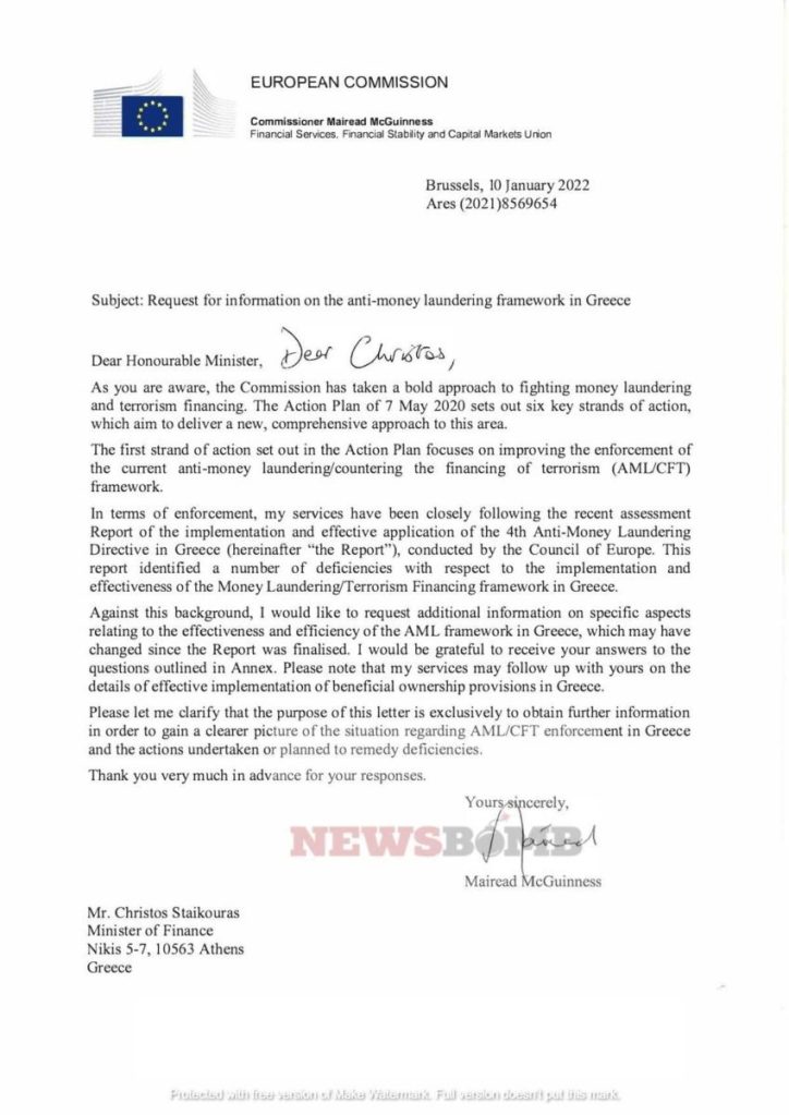 Στο στόχαστρο της Κομισιόν βρίσκεται η Ελλάδα, με επιστολή που απηύθυνε η Ευρωπαία Επίτροπος Χρηματοπιστωτικής Σταθερότητας Μέιριντ Μακγκίνες στις 10 Ιανουαρίου 2022 στον υπουργό Οικονομικών, Χρήστο Σταϊκούρα, με την οποία του ζητάει να απαντήσει για μια σειρά από σοβαρά ζητήματα που αναδείχθηκαν κατά την αξιολόγηση που διενήργησε προ μηνών το Συμβούλιο της Ευρώπης στους φορείς που εμπλέκονται στην καταπολέμηση του ξεπλύματος χρήματος στην Ελλάδα.