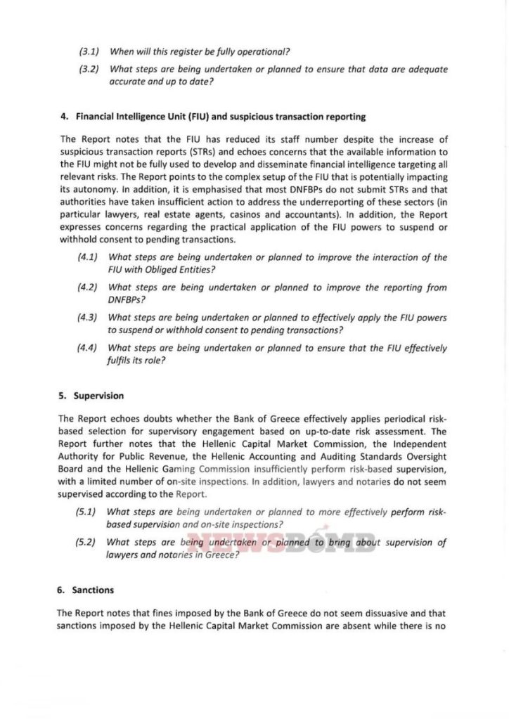 Επιτρέψτε μου να διευκρινίσω ότι σκοπός αυτής της επιστολής είναι αποκλειστικά η απόκτηση περαιτέρω πληροφοριών προκειμένου να αποκτηθεί μια σαφέστερη εικόνα της κατάστασης σχετικά με την επιβολή του νόμου για την καταπολέμηση του ξεπλύματος χρήματος και της χρηματοδότησης της τρομοκρατίας στην Ελλάδα και των ενεργειών που αναλήφθηκαν ή σχεδιάζονται για την αποκατάσταση των ελλείψεων.