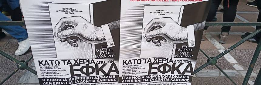 Νέα 24ωρη απεργία στον ΕΦΚΑ για αύριο, Πέμπτη 17 Φεβρουαρίου, προκήρυξε η Πανελλήνια Ομοσπονδία Προσωπικού Οργανισμών Κοινωνικής Πολιτικής (ΠΟΠΟΚΠ), αντιδρώντας στον νομοσχέδιο για την αναμόρφωση του φορέας που συζητείται στη Βουλή. Θυμίζουμε ότι 24ωρη απεργία πραγματοποιήθηκε και σήμερα με συγκέντρωση στο υπουργείο Εργασίας. Σε ανακοίνωσή της η ΠΟΠΟΚΠ τονίζει ότι η «κυβέρνηση με το νέο αντιλαϊκό νομοσχέδιο που κατέθεσε στη Βουλή, για τον«εκσυγχρονισμό» του ΕΦΚΑ,