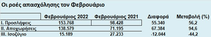 Επίσης, τον περασμένο μήνα, οι προσλήψεις ήταν 153.768, έναντι 98.428 τον Φεβρουάριο του 2021, σημειώνοντας αύξηση κατά 55.340 θέσεις ή κατά 56,2%.