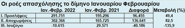 Το ισοζύγιο της απασχόλησης το πρώτο δίμηνο του 2022 ήταν αρνητικό κατά 10.615 θέσεις, ενώ πέρυσι οι προσλήψεις ήταν περισσότερες των απολύσεων κατά 29.571 θέσεις.