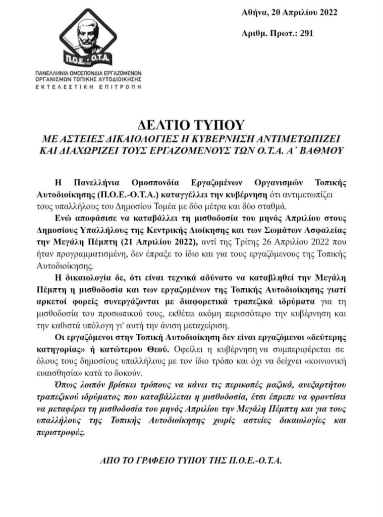 Η Πανελλήνια Ομοσπονδία Εργαζομένων Οργανισμών Τοπικής Αυτοδιοίκησης (Π.Ο.Ε.-Ο.Τ.Α.) με ανακοίνωση – καταγγελία κάνει λόγο ότι, η Κυβέρνηση αντιμετωπίζει τους υπαλλήλους του Δημοσίου Τομέα με δύο μέτρα και δύο σταθμά. «Ενώ αποφάσισε να καταβάλλει τη μισθοδοσία του μηνός Απριλίου στους Δημοσίους Υπαλλήλους της Κεντρικής Διοίκησης και των Σωμάτων Ασφαλείας την Μεγάλη Πέμπτη (21 Απριλίου 2022), αντί της Τρίτης 26 Απριλίου 2022 που ήταν προγραμματισμένη, δεν έπραξε το ίδιο και για τους εργαζόμενους της Τοπικής Αυτοδιοίκησης.
