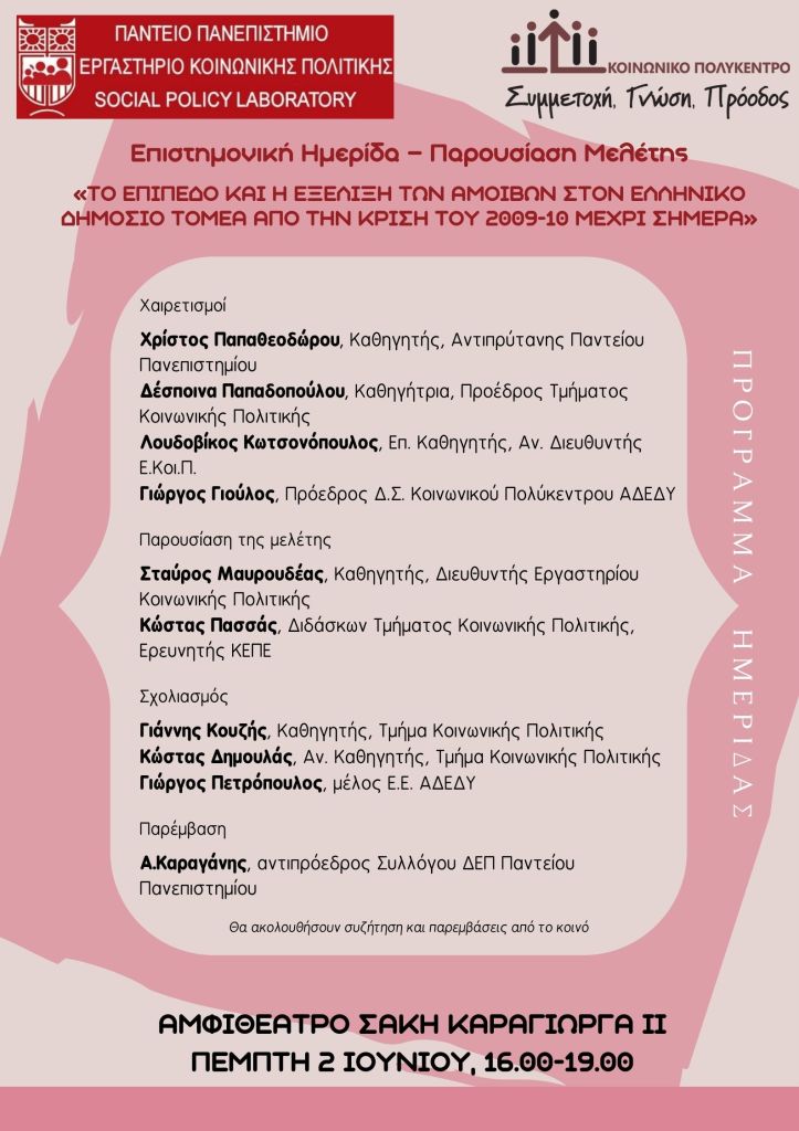 Το Κοινωνικό Πολύκεντρο της ΑΔΕΔΥ σε συνεργασία με το Εργαστήριο Κοινωνικής Πολιτικής του Παντείου Πανεπιστημίου σας προσκαλούν στο αμφιθέατρο Σάκη Καράγιωργα ΙΙ (Λεωφ. Ανδρέα Συγγρού 136 Φραγκούδη Πάντου, Αθήνα 176 71) την Πέμπτη 2 Ιουνίου και ώρες 16.00-19.00 για την παρουσίαση της μελέτης «Το επίπεδο και η εξέλιξη των αμοιβών στον ελληνικό δημόσιο τομέα από την κρίση του 2009-10 μέχρι σήμερα» των Στ. Μαυρουδέα και Κ. Πασσά.