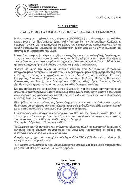 Η δικαιοσύνη με τη χθεσινή της απόφαση ( 21/07/2022 ) στα δικαστήρια της Καβάλας έκρινε ένοχο τον Προϊστάμενο Διοικητικών Υπηρεσιών των Λιπασμάτων Καβάλας κ. Γεώργιο Τσιλίκα, για τις κατηγορίες σε βάρος των εργαζομένων καταδικάζοντάς τον για ψευδή καταμήνυση, ψευδορκία και συκοφαντική δυσφήμιση με 45 μήνες φυλάκιση και απαγόρευση εξόδου από την χώρα.