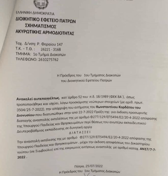 Όπως δημοσιεύει το News 24/7, με απόφαση της Προέδρου του 1ου τμήματος Διακοπών του Διοικητικού Εφετείου Πατρών (και μετά από νέα στοιχεία που προσκόμισε ο εκπαιδευτικός) δόθηκε τελικά προσωρινή εντολή για αναστολή εκτέλεσης της απόφασης Κεραμέως με την οποία ο κ. Κορδάτος έμπαινε σε δυνητική αργία (χάνοντας, έτσι, τα 2/3 των αποδοχών του).