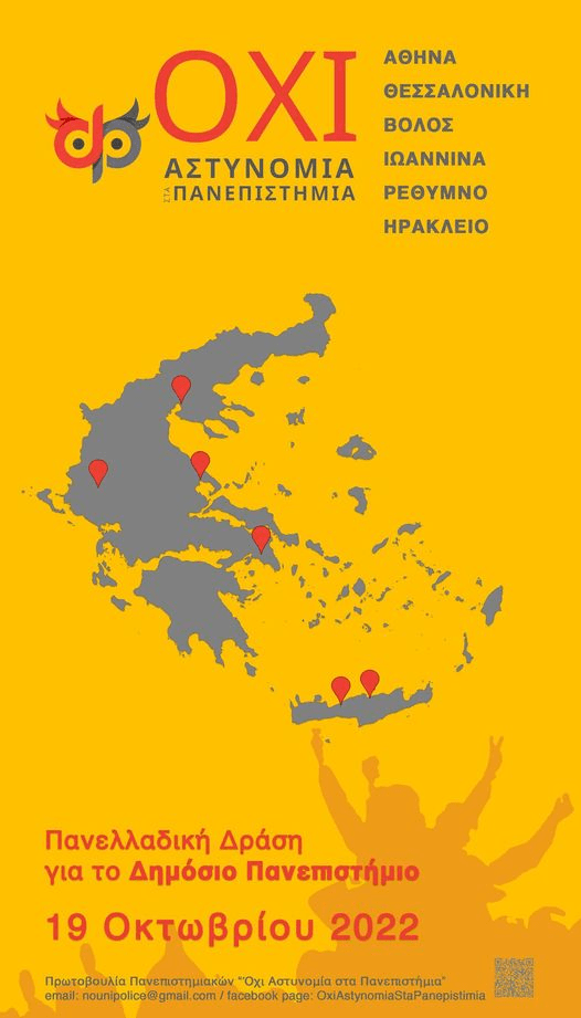 Σήμερα: Στις 12.00 στην Αρχιτεκτονική της Αθήνας, στις 11.00 στη Νομική του ΑΠΘ, στις 18.30 στο Παπαστράτου στο Βόλο, στις 12.00 στην Πρυτανεία στα Γιάννενα, στις 12.00 στο Κτίριο Κ12.1 ΣΕΔΟ στον Εσταυρωμένο στο Ηράκλειο, στις 18.00 στη Φιλοσοφική στο Ρέθυμνο.