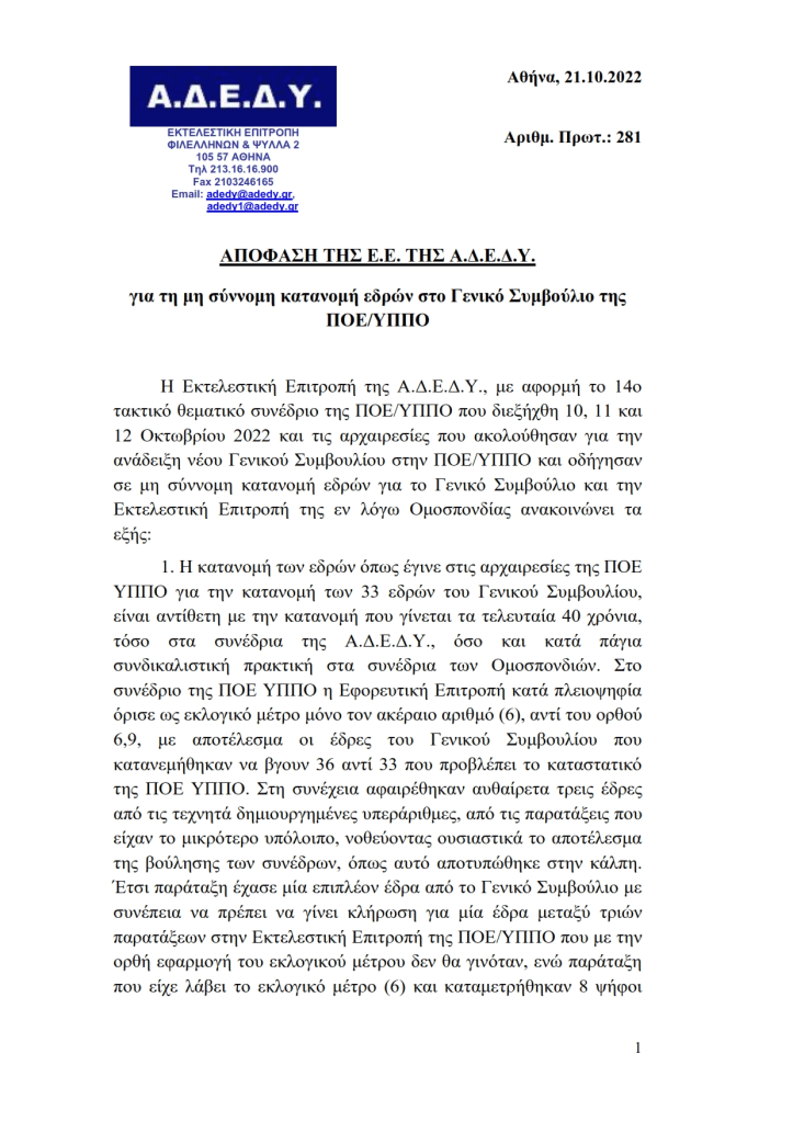 Απόφαση ΑΔΕΔΥ σχετικά με την μη σύννομη κατανομή των εδρών για το ΓΣ της ΠΟΕ-ΥΠΠΟ 21.10.22