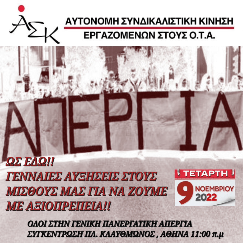ΑΣΚ ΟΤΑ: Ολοι και όλες στην 24ΩΡΗ ΠΑΝΕΛΛΑΔΙΚΗ ΑΠΕΡΓΙΑ, Τετάρτη 9 Νοεμβρίου 2022.!