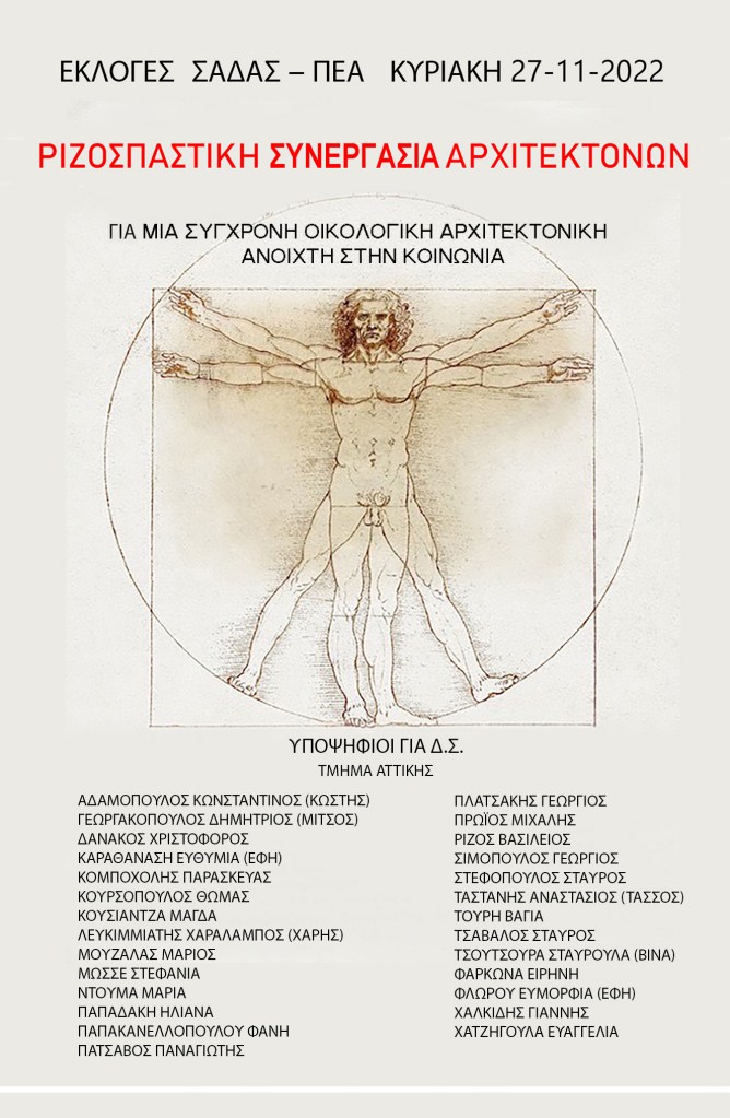 Εκλογές ΣΑΔΑΣ – Πανελλήνιας Ένωσης Αρχιτεκτόνων 27/11, στηρίζουμε Ριζοσπαστική Συνεργασία Αρχιτεκτόνων