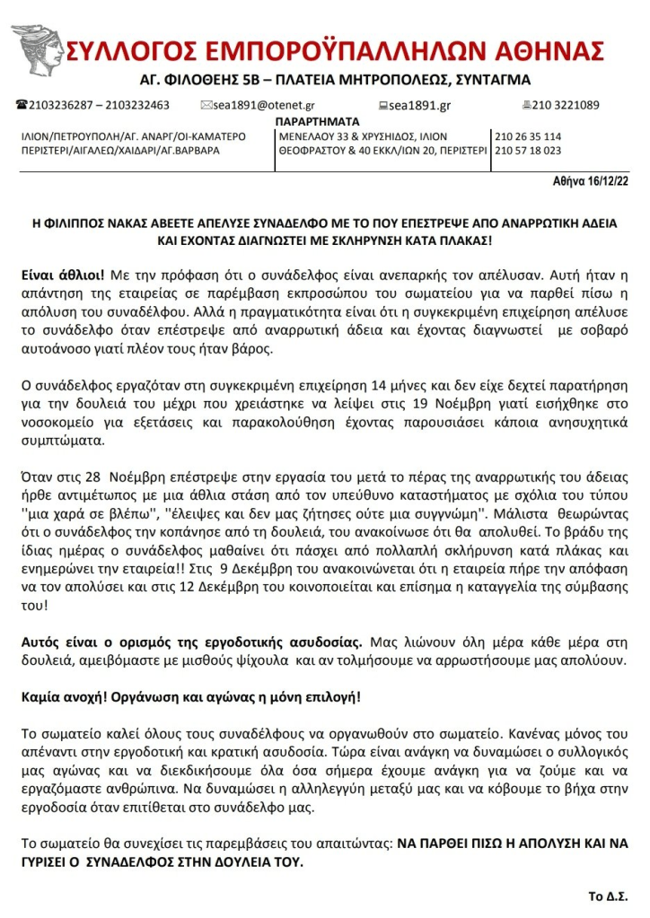 Η εταιρία “Φίλιππος Νάκας” απέλυσε συνάδελφο μόλις γύρισε από αναρρωτική & έχοντας διαγνωστεί με σκλήρυνση κατά πλάκας