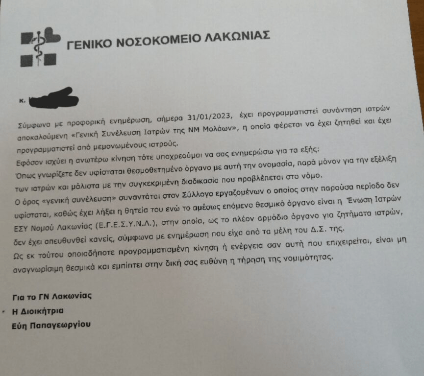 ΟΕΝΓΕ: Η διοικήτρια του ΓΝ Λακωνίας προσπάθησε να… εμποδίσει τη συνέλευση των γιατρών