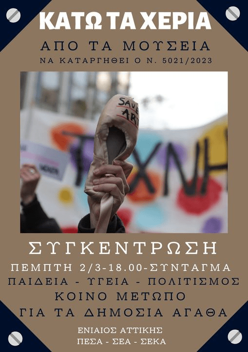 Κοινό συντονιστικό πρωτοβαθμίων Σωματείων του ΥΠΠΟΑ – Συμμετέχουμε στην Πορεία διαμαρτυρίας στις 18:00 στο Σύνταγμα