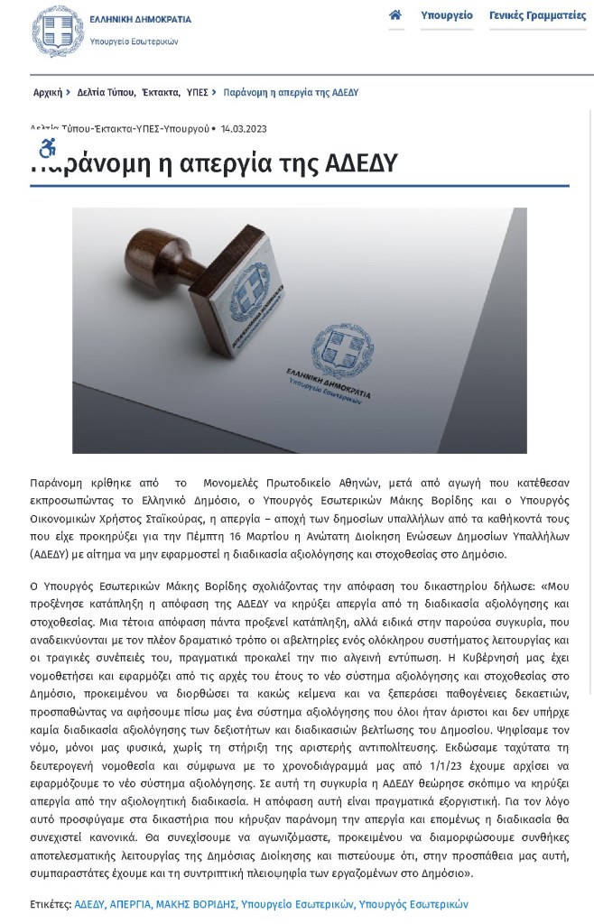 Προβοκάτσια από το ΥΠΕΣ καταγγέλλει η ΑΔΕΔΥ για την Απεργία στις 16-03-2023