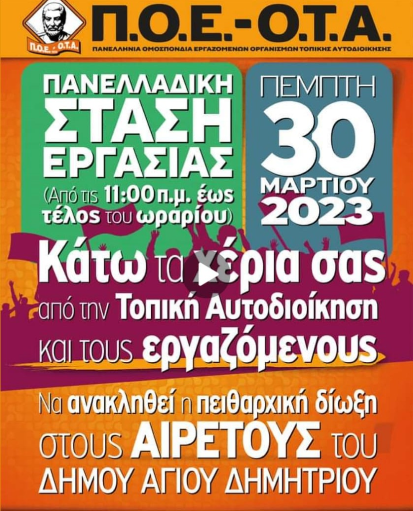 Με αιτία τη μονιμοποίηση των συμβασιούχων που πρόσφεραν τα μέγιστα στην πρόσφατη, πρωτόγνωρη Πανδημία – πολλώ δε μάλλον – όταν πολλοί απ’ αυτούς έχουν δικαιωθεί πρωτόδικα από την Ελληνική Δικαιοσύνη και με αφορμή την κλήση σε απολογία, 27 Δημοτικών Συμβούλων του Δήμου Αγίου Δημητρίου, για την ομόφωνη απόφασή τους, να μην εφεσιβάλουν κατά των πρωτόδικων αποφάσεων, η ΠΟΕ-ΟΤΑ προκηρύσσει Πανελλαδική Στάση Εργασίας, για την ερχόμενη Πέμπτη 30 Μαρτίου, από τις 11 το πρωί έως τη λήξη του ωραρίου και απεργιακή συγκέντρωση, στις 12 το μεσημέρι, στο Υπουργείο Εσωτερικών.