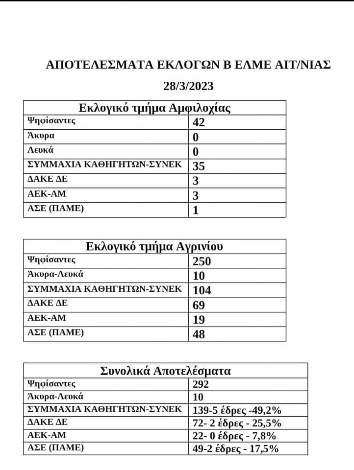 Αποτελέσματα εκλογών Β ΕΛΜΕ Αιτωλοακαρνανίας 28/3/2023 Posted on 29/03/2023 by ΑΡΚΙ ΣΥΝΕΚ 5 έδρες (από 4) ΔΑΚΕ 2 έδρες (από 3) ΠΑΜΕ 2 έδρες (από 1) Παρεμβάσεις 0 έδρες (από 1) κοινοποιήση: Κλικ για αποστολή ενός συνδέσμου μέσω email σε έναν/μία φίλο/η(Ανοίγει σε νέο παράθυρο) Email Κλικ για εκτύπωση(Ανοίγει σε νέο παράθυρο) Εκτύπωση Πατήστε για κοινοποίηση στο Facebook(Ανοίγει σε νέο παράθυρο) Facebook Κλικ για κοινοποίηση στο LinkedIn(Ανοίγει σε νέο παράθυρο) LinkedIn Κάνε κλικ για να μοιραστείς στο X(Ανοίγει σε νέο παράθυρο) Χ Μου αρέσει! Φόρτωση... Σχετικά tagged with ΑΙΤ/ΝΙΑΣ, Β ΕΛΜΕ Συνδικαλιστικά