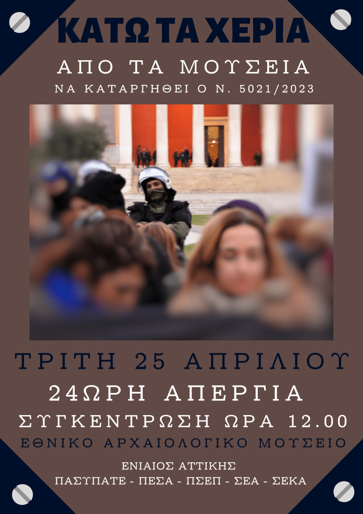 - προκηρύσσει 24ωρη απεργία την Τρίτη 25 Απριλίου και συγκέντρωση διαμαρτυρίας στο Εθνικό Αρχαιολογικό Μουσείο στις 12.00.