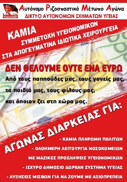 Καλούμε ΟΛΟΥΣ τους συναδέλφους στα Χειρουργεία, στο Αναισθησιολογικό και το λοιπό προσωπικό, στα σχέδια της Κυβέρνησης για τη περαιτέρω ιδιωτικοποίηση της Υγείας και τη πληρωμή των υπηρεσιών από τους πολίτες, να πουν ένα μεγάλο ΟΧΙ: