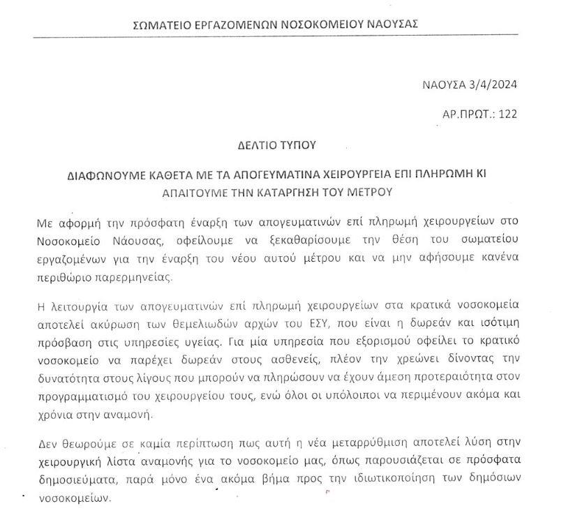 Σωματείο Εργαζομένων Νοσοκομείου Νάουσας: Διαφωνούμε κάθετα με τη λειτουργία των απογευματινών χειρουργείων επί πληρωμή